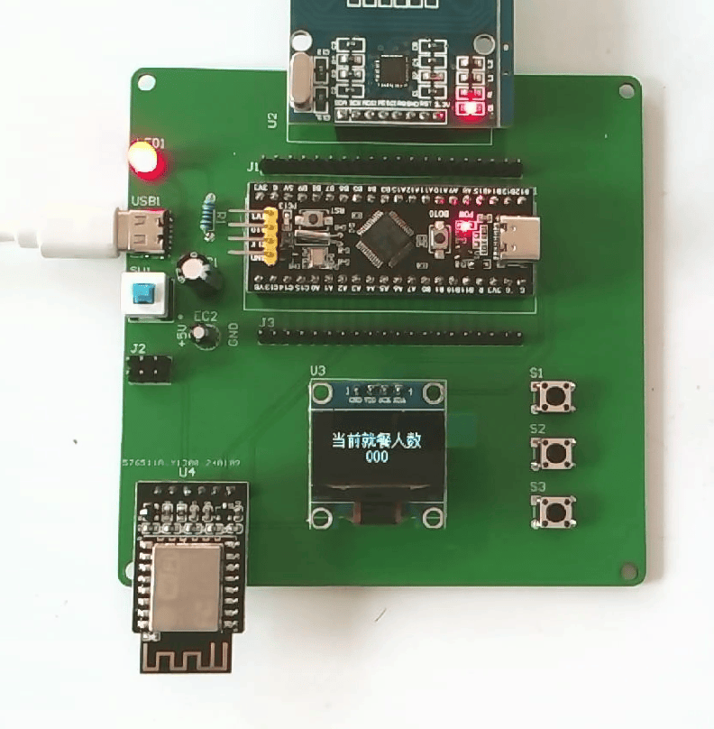 通过RFID感应模块通过对RFID卡进行监测,人数会加一,当顾客用完餐后再次刷卡,人数会减一