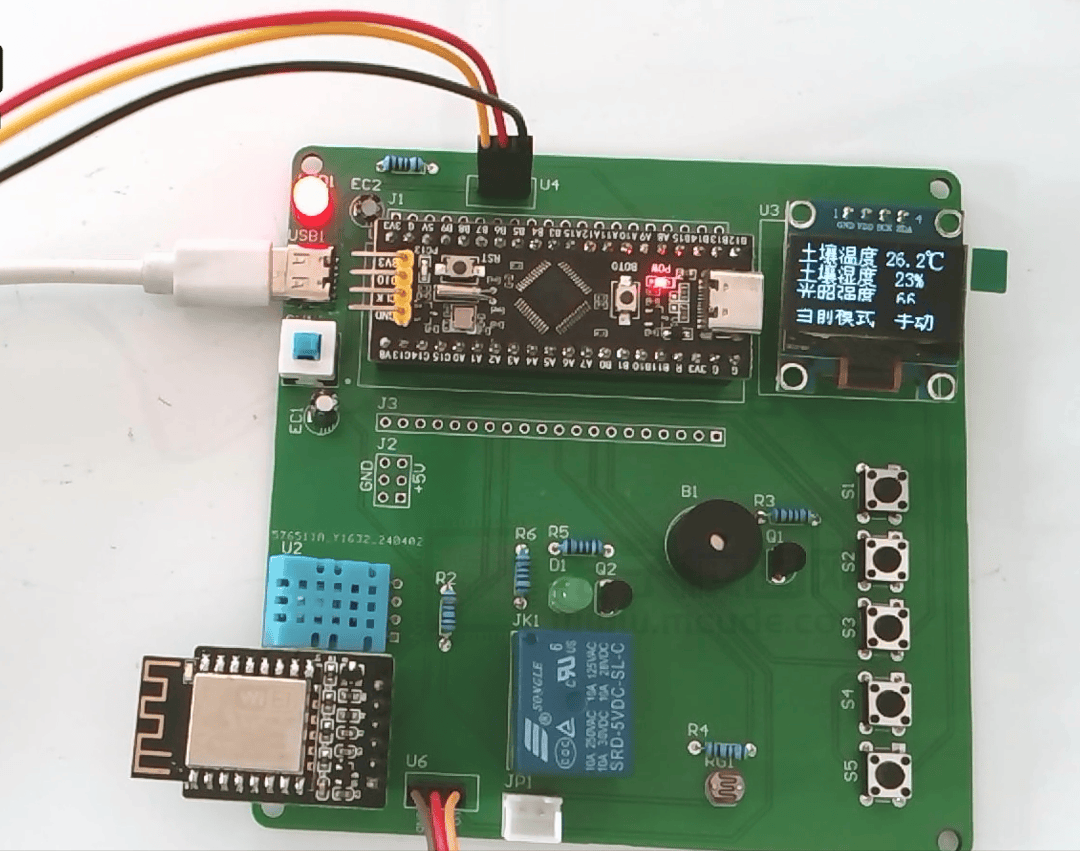 通过土壤湿度传感器检测土壤湿度,土壤温湿度达到阀值时,自动给植物浇水。